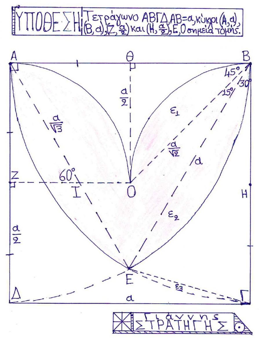 Προχωρείστε σε ακριβείς κοσμηματικές χρωματικές μετρήσεις, σχεδιάσατε συγκριτικές ομοιοματικές επαναφερόμενες παραλλαγές και με τη δεκάδα των σημειούμενων σημείων του σχήματος, να βρείτε: τα πολλαπλάσια της γωνίας των 15 , είδη τριγώνων ως προς τις γωνίες τους ή τις πλευρές τους, κάθετες ή παράλληλες ευθείες, μεσοκάθετη τμήματος, σχέση τμημάτων με εφαρμογή και του πυθαγόρειου θεωρήματος, περιμέτρους, τεταρτοκύκλια, κυκλικά τμήματα, ...