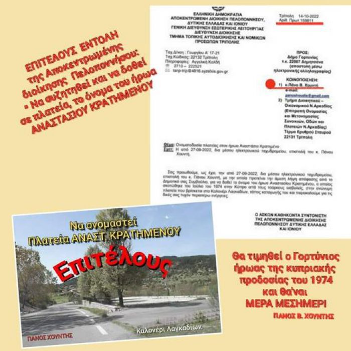 Αναφέρομαι στον 2ετή αγώνα της Επιτροπής Επαναπατρισμού των οστών του Γορτύνιου ήρωα ΑΝΑΣΤΑΣΙΟΥ ΚΡΑΤΗΜΕΝΟΥ, κατά την κυπριακή τραγωδία του 1974 και την ονοματοδοσία σε μια πλατεία στο Καλονέρι Λαγκαδίων, με το όνομα του, που είναι και η γενέτειρα του.
