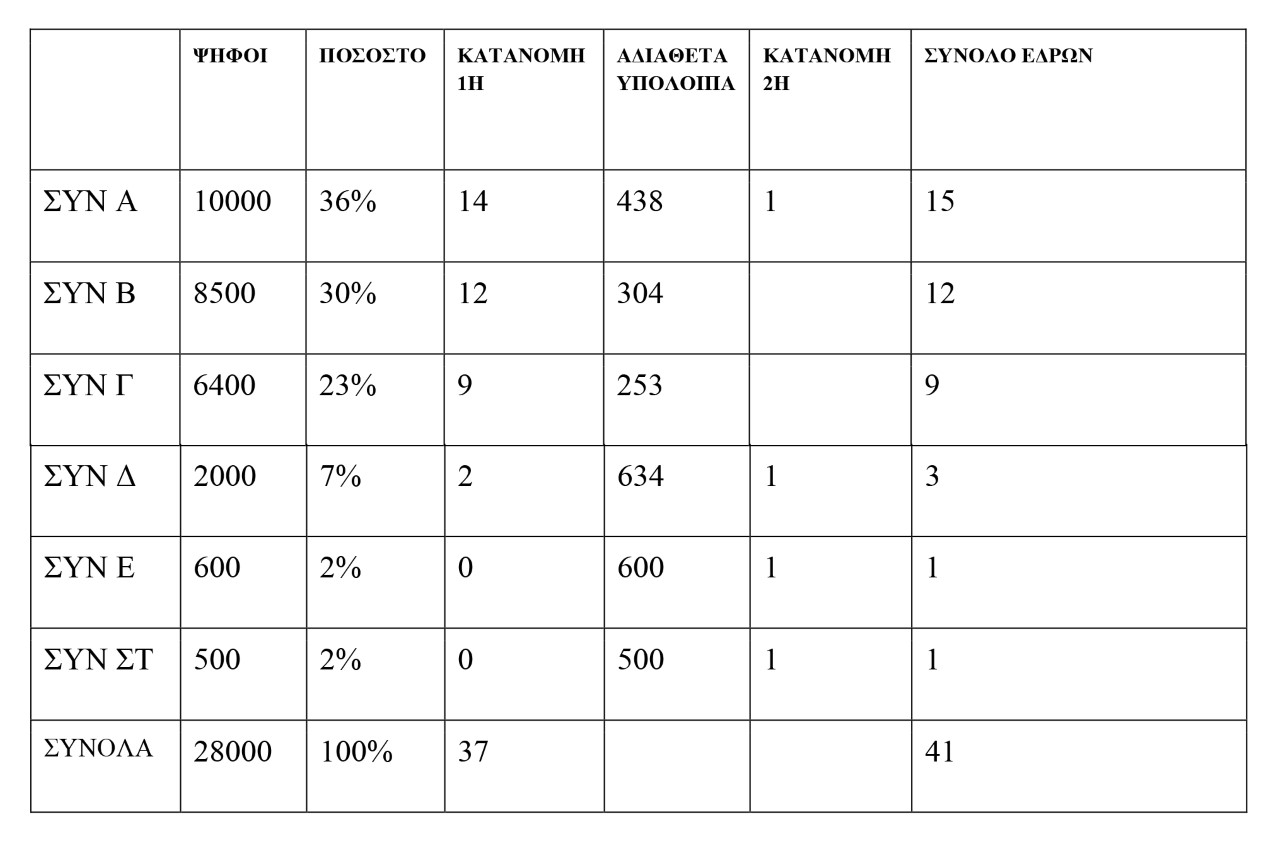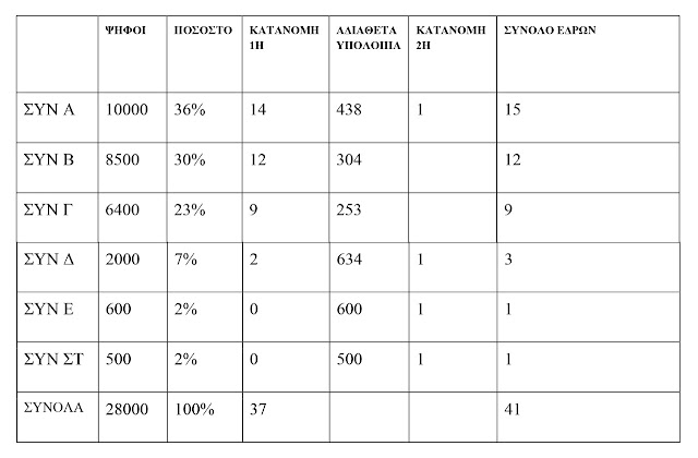 Ας πάρουμε ένα υποθετικό παράδειγμα στο Δήμο Άργους – Μυκηνών ας υποθέσουμε ότι βρέθηκαν 28.000 έγκυρα ψηφοδέλτια και οι έδρες του δημοτικού συμβουλίου είναι 41. Στο παράδειγμα εργασίας έχουμε τα κάτωθι αποτελέσματα