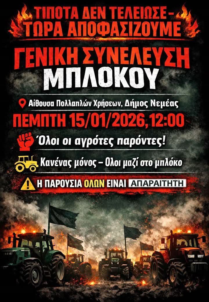 Σε κρίσιμο σημείο βρίσκονται οι αγροτικές κινητοποιήσεις, με τους αγρότες να δηλώνουν ξεκάθαρα πως «τίποτα δεν τελείωσε – τώρα αποφασίζουμε». Στο πλαίσιο αυτό, καλείται Γενική Συνέλευση την Πέμπτη 15 Ιανουαρίου 2026, στις 12:00 το μεσημέρι, στην Αίθουσα Πολλαπλών Χρήσεων του Δήμου Νεμέας.Η συνέλευση θεωρείται καθοριστική για τη συνέχεια των κινητοποιήσεων, καθώς εκεί θα συζητηθούν και θα ληφθούν αποφάσεις για τα επόμενα βήματα του αγώνα, με στόχο την υπεράσπιση του εισοδήματος και της επιβίωσης του αγροτικού κόσμου.Οι διοργανωτές απευθύνουν κάλεσμα σε όλους τους αγρότες να δώσουν δυναμικό “παρών”, τονίζοντας πως η ενότητα και η συλλογική παρουσία είναι απαραίτητες. «Κανένας μόνος – όλοι μαζί στο μπλόκο» είναι το μήνυμα που εκπέμπεται, υπογραμμίζοντας ότι μόνο μέσα από κοινή δράση μπορούν να υπάρξουν αποτελέσματα.