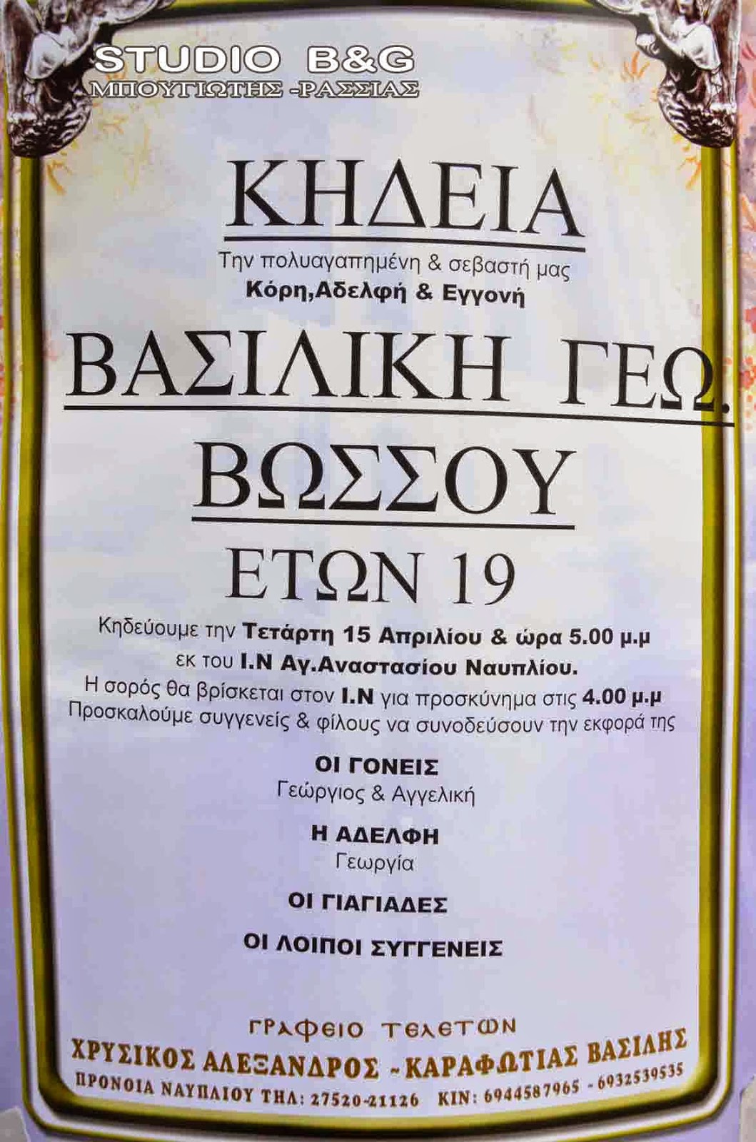 Η κηδεία της άτυχης 19χρονης θα γίνει σήμερα στον Ιερό Ναό του Αγίου Αναστασίου Ναυπλίου στις 17:00μμ., ενώ η σορός της θα βρίσκεται στον ναό για προσκύνημα στις 16:00μμ.