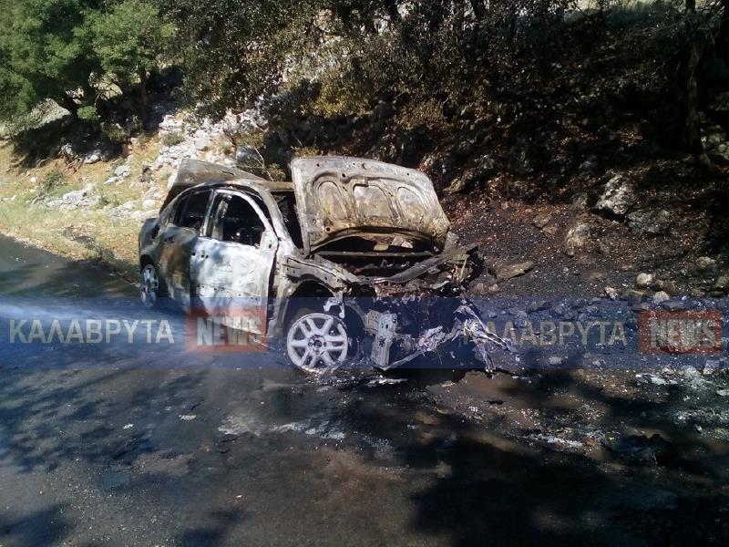 Καλάβρυτα | Αυτοκίνητο κάηκε ολοσχερώς μετά από πρόσκρουση σε βράχο