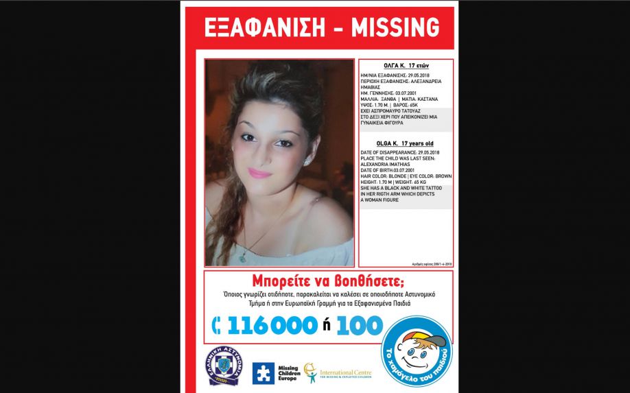 Στις 29/5/2018, στις 15:00 ώρα, εξαφανίστηκε από την Αλεξάνδρεια Ημαθίας, η Όλγα Κ., 17 ετών. Η Όλγα Κ. έχει ύψος 1,70 μ., ζυγίζει 65 κιλά, έχει ξανθά μαλλιά και καστανά μάτια. Η Όλγα έχει τατουάζ στο δεξί της χέρι που απεικονίζει γυναικεία φιγούρα.