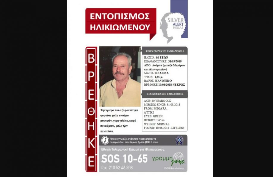 Ο άτυχος 80χρονος, είχε εξαφανισθεί την 31/03/2018, στην περιοχή Λούμπα, μεταξύ Μεγάρων και Αλεποχωρίου, όπου είχε πάει με φίλους του για να μαζέψουν χόρτα. Έκτοτε δεν είχε δώσει σημεία ζωής. Η ΓΡΑΜΜΗ ΖΩΗΣ, μετά από αίτημα των οικείων του και με τη συγκέντρωση των απαραίτητων δικαιολογητικών, εξέδωσε SILVER ALERT για την κινητοποίηση όλων για την ανεύρεσή του. Δυστυχώς, βρέθηκε νεκρός…