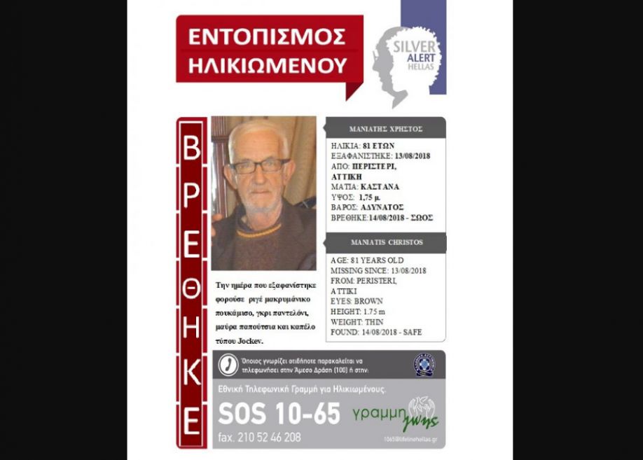 Η ΓΡΑΜΜΗ ΖΩΗΣ, μετά από αίτημα των συγγενών και με τη συγκέντρωση των απαραίτητων δικαιολογητικών, ενεργοποίησε το SILVER ALERT, το απόγευμα της 13/08/2018, για την κινητοποίηση όλων για την ανεύρεσή του.