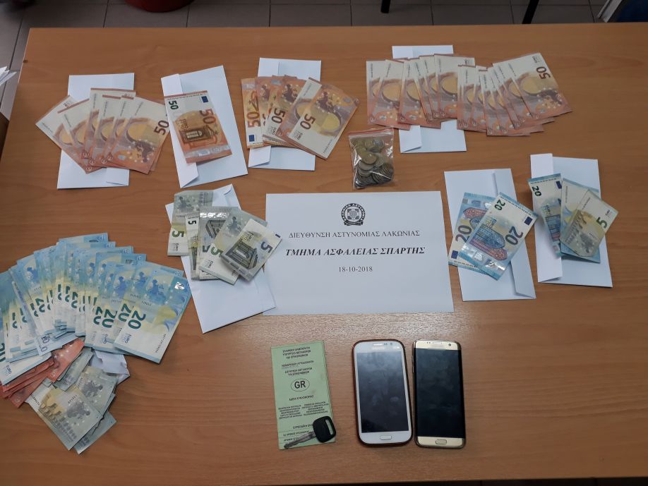 Μετά από άμεση κινητοποίηση, αστυνομικοί της Ομάδας Δίκυκλης Αστυνόμευσης (ΔΙ.ΑΣ.) Λακωνίας, εντόπισαν την 52χρονη και τον 32χρονο, οι οποίοι επέβαιναν σε Ι.Χ.Ε. αυτοκίνητο και τους συνέλαβαν, ενώ στην κατοχή τους και στο εσωτερικό του οχήματος βρέθηκαν συνολικά και κατασχέθηκαν -28- αμφιβόλου γνησιότητας χαρτονομίσματα των -50- ευρώ, το χρηματικό ποσό των -1.318,70- ευρώ και δύο (2) κινητά τηλέφωνα.
