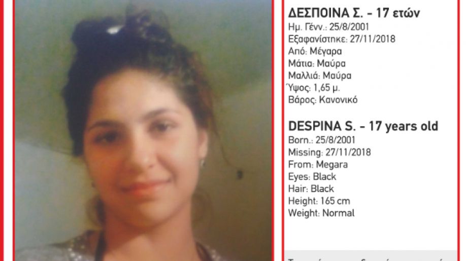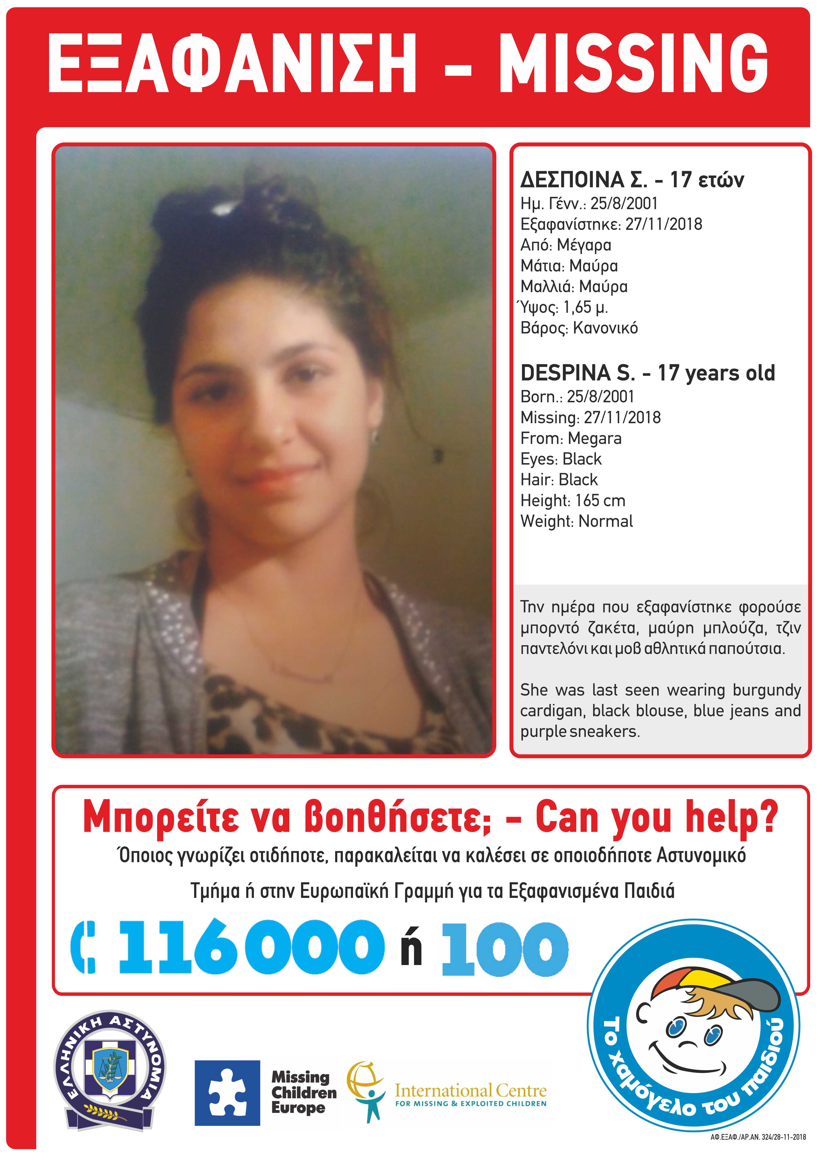 Στις 27/11/2018 στις 12:00μμ, εξαφανίστηκε από τα Μέγαρα, η Δέσποινα Σ., 17 ετών. Η Δέσποινα Σ. έχει ύψος 1,65 μ., κανονικό βάρος, έχει μαύρα μαλλιά και μαύρα μάτια. Φορούσε μπορντό ζακέτα , μαύρη μπλούζα, τζιν παντελόνι και μοβ αθλητικά παπούτσια.