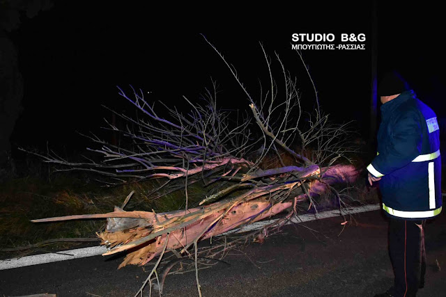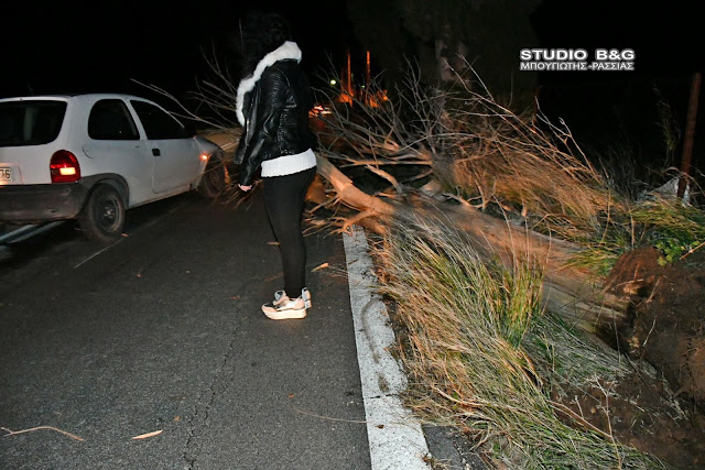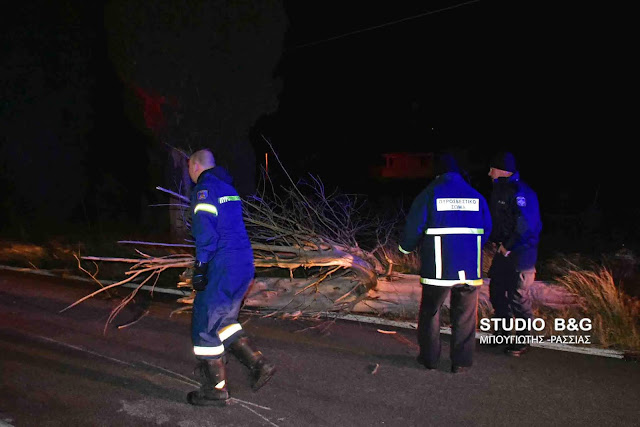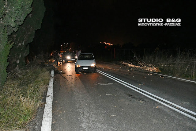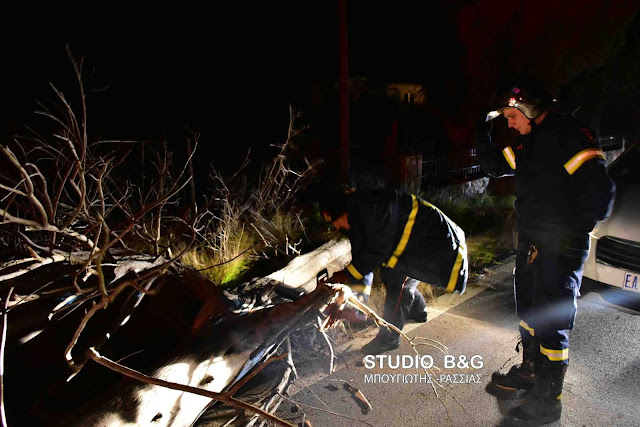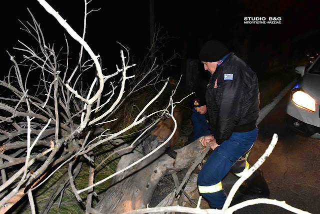 Όχημα της Πυροσβεστικής Υπηρεσίας Ναυπλίου με άνδρες έκοψαν το δένδρο και ελευθέρωσαν το δρόμο που δόθηκε και πάλι στην κυκλοφορία από την αστυνομία.