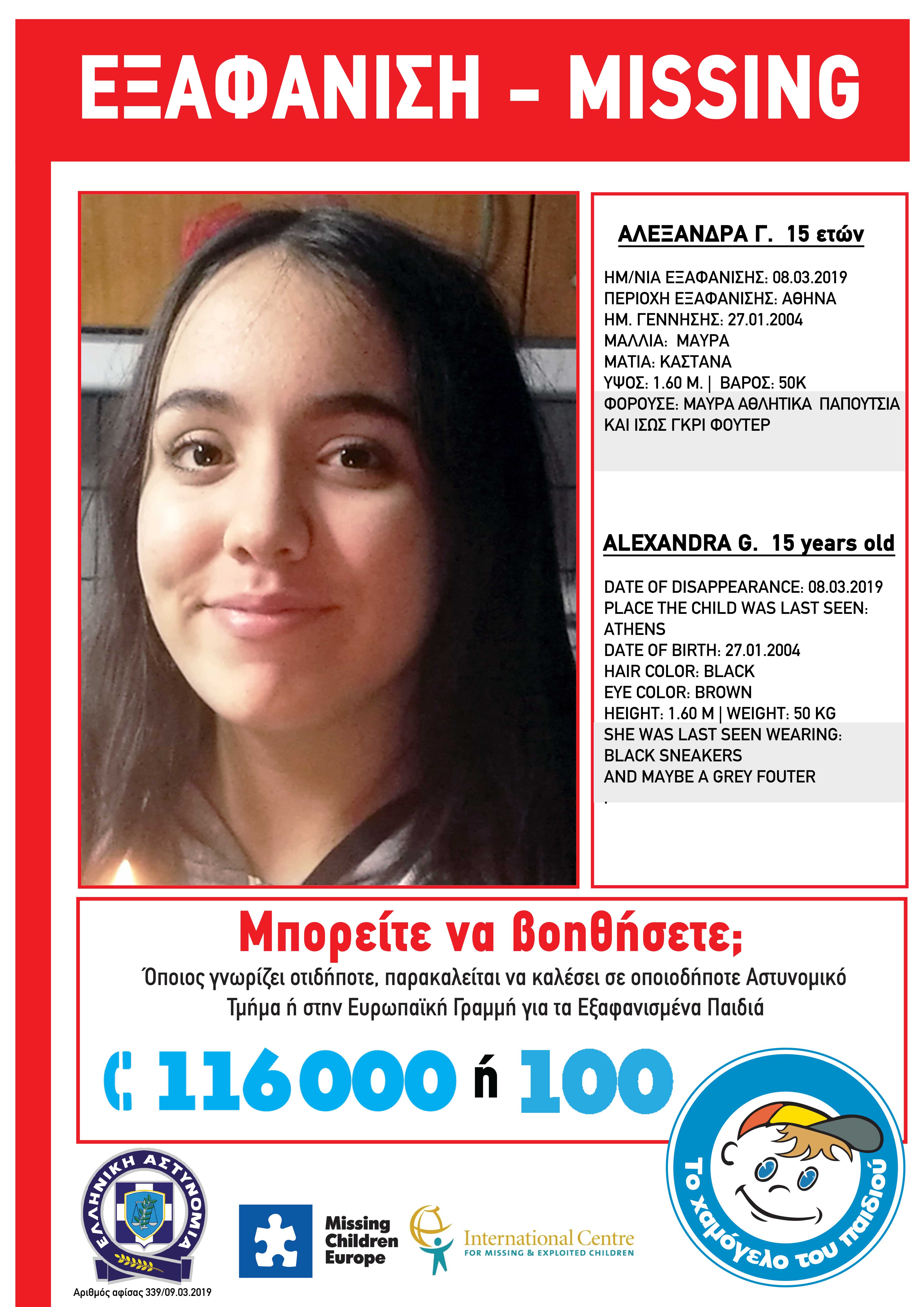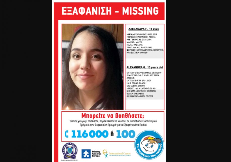 Στις 8/3/19, στις 17:00, εξαφανίστηκε από το σπίτι της, η Αλεξάνδρα Γ., 15 ετών. Η Αλεξάνδρα Γ. έχει ύψος 1,60 μ., ζυγίζει 50 κιλά, έχει μαύρα μαλλιά και καστανά μάτια.