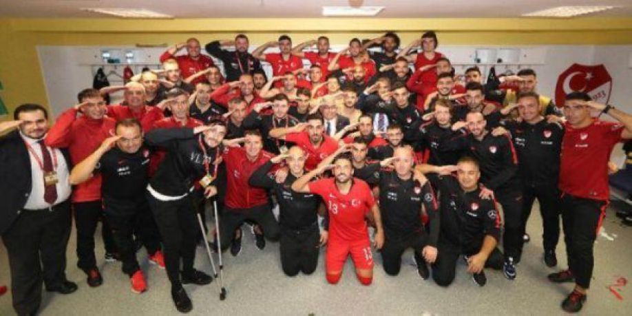 Το βράδυ της Παρασκευής (11/10) η εθνική ποδοσφαίρου της Τουρκίας κέρδισε την Αλβανία για τα προκριματικά του Euro 2020 χάρη σε γκολ του Τοσούν στις καθυστερήσεις και οι Τούρκοι ποδοσφαιριστές έσπευσαν να πανηγυρίσουν μπροστά στους φανατικούς οπαδούς με στρατιωτικό χαιρετισμό.