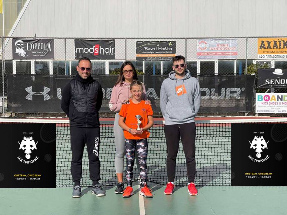 Πρόεδρος του Δ.Σ της AEK TPIΠOΛHΣ κ. Bαλασόπουλος, το Δ.Σ. , ο έφορος αγωνιστικού του τμήματος αντισφαίρισης κ. Κούλης και η προπονητική ομάδα των κ. Παπαδόπουλου, κας. Σταθούλη και κ. Διονυσόπουλου συγχαίρουν την αθλήτρια του ομίλου τένις Κοράκη Χαρίκλεια για την κατάκτηση της 2ης Πανελλαδικής θέσης στο 1ο Πανελλαδικό τουρνουά Ε2 της χρονιάς .
