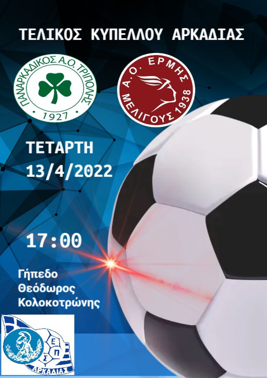 Στον τελικό Κυπέλλου Αρκαδίας μεταξύ των ομάδων Παναρκαδικός-Ερμής Μελιγούς, ο οποίος θα διεξαχθεί στο γήπεδο "Θεόδωρος Κολοκοτρώνης" την Τετάρτη 13.4.2022, η τιμή εισιτηρίου είναι στα 5 ευρώ.