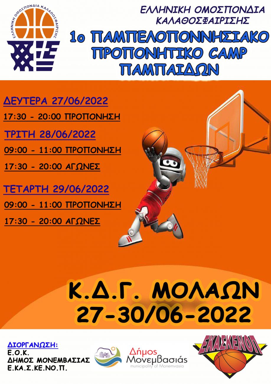 Στα πλαίσια του Αναπτυξιακού Προγράμματος της Ελληνικής Ομοσπονδίας Καλαθοσφαίρισης (Ε.Ο.Κ.), σε συνεργασία με τον Δήμο Μονεμβασιάς και την Ε.ΚΑ.Σ.ΚΕ.ΝΟ.Π., θα πραγματοποιηθεί στο κλειστό γυμναστήριο των Μολάων, το 1ο Παμπελοποννησιακό προπονητικό camp παμπαίδων, το διάστημα 27-30 Ιουνίου 2022.