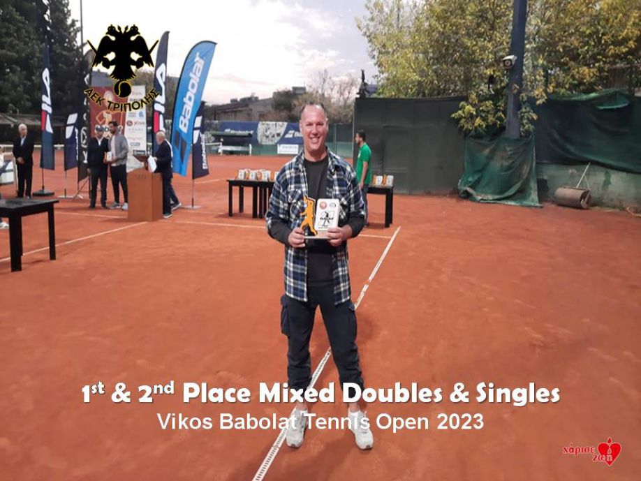 Έχει γίνει θεσμός πλέον για τον αθλητή της ΑΕΚ Τρίπολης Δαβίδ Ζωγραφάκη η Συμμετοχή αλλά και η κατάκτηση διακρίσεων στο φημισμένο τουρνουά της Θεσσαλονίκης, με την ονομασία Vikos Babolat Tennis Open. Την φετινή χρονιά ο Δαβίδ κατέκτησε την 1η και την 2η θέση στα μικτά διπλά με συναθλήτρια την Κατσαρίδου Θάλεια και στα μονά των 45+ αντίστοιχα. Πιο συγκεκριμένα ο αθλητής της ΑΕΚ Τρίπολης στα μικτά διπλά, μαζί με το αθλητικό του ζευγάρι, την Κατσαρίδου, κατέκτησαν την 1η θέση κερδίζοντας στον πρώτο γύρο τους Τζορμπανίδη και Γεωργάλα με 64, 75 και στον δεύτερο γύρο τους Βαφειάδη και Κοπανίτσα με 61, 61 μπαίνοντας την τετράδα του τουρνουά. Στον ημιτελικό επικράτησαν των Γεωργαλά και Αθανασιάδου με 64 64 και στον μεγάλο τελικό των Βαλογιώργη και Μποτσόλη με 63, 62 κατακτώντας την 1η θέση του τουρνουά.