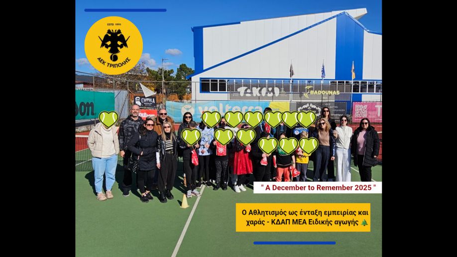 Το Τμήμα Τένις της ΑΕΚ Τρίπολης υλοποίησε με επιτυχία τον πρώτο κύκλο του νέου, ειδικά σχεδιασμένου προγράμματος τένις για τα παιδιά του ΚΔΑΠ ΜΕΑ Δήμου Τρίπολης, επιβεβαιώνοντας έμπρακτα τη διαχρονική του φιλοσοφία για έναν αθλητισμό ανοιχτό, προσβάσιμο και ουσιαστικό για όλους.