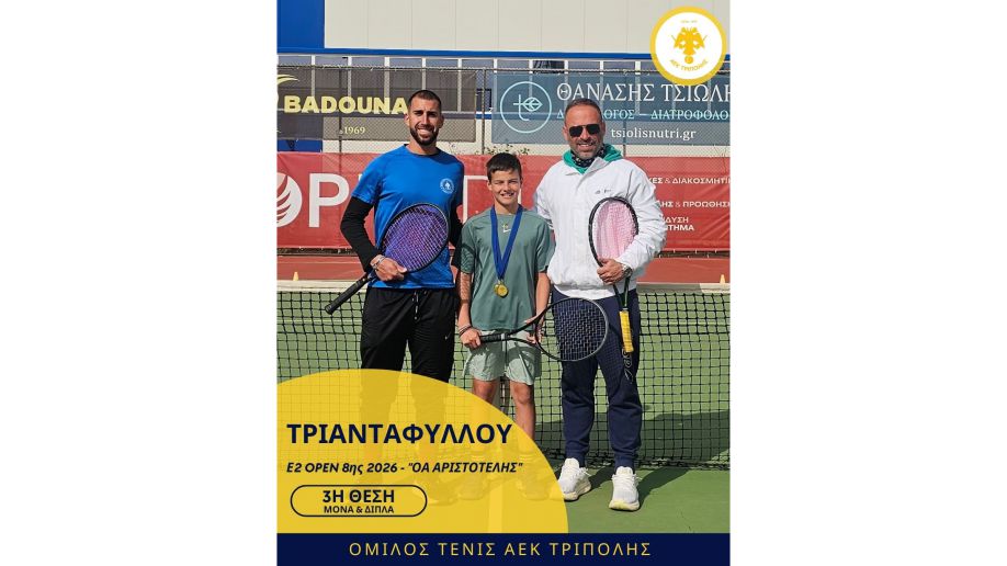 Σημαντική αγωνιστική επιτυχία σημείωσε ο αθλητής του Ομίλου Τένις της ΑΕΚ Τρίπολης Αθανάσιος (Θάνος) Τριανταφύλλου, ο οποίος κατέκτησε την 3η θέση τόσο στα Μονά όσο και στα Διπλά στο 1ο Ε2 Πανελλαδικό Πρωτάθλημα του 2026 στην κατηγορία Αγοριών 12 ετών, που φιλοξενήθηκε στις εγκαταστάσεις του ΟΑ Αριστοτέλης.