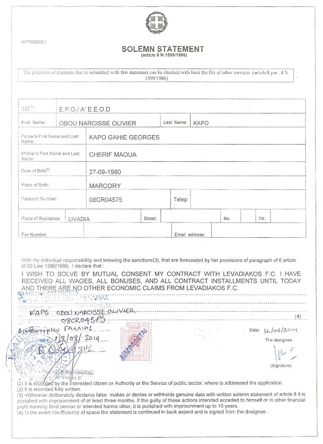 «Πριν από ένα παιχνίδι, δέχτηκα κόσμο στο σπίτι μου και γείτονες μου ζητούσαν να πάρω κόκκινη κάρτα επειδή το είχαν ποντάρει στο στοίχημα και μου υποσχέθηκαν να μου έδιναν μέρος από τα κέρδη. Την επόμενη ημέρα με πήρε τηλέφωνο ο πρόεδρος να μου πει εάν δέχτηκα την πρόταση. Του είπα ότι εγώ είμαι άνθρωπος νομοταγής , δεν κάνω τέτοια και εάν ήθελε ένα παιχνίδι να είναι διεφθαρμένο, θα μπορούσε να ρθει να μου ζητήσει να εγκαταλείψω την ομάδα. Μου είπε: "Δε θα πας πουθενά. Θα σε σκοτώσω μαζί τα παιδιά σου και τη γυναίκα σου. Δε θα ξαναδείς την οικογένειά σου." Ακόμη και η Αφρική είναι σε καλύτερη μοίρα από την Ελλάδα. Συνάντησα πολλούς ανθρώπους που ήταν συζητήσεις με ομάδες από την Ελλάδα. Προσπαθώ να τους προειδοποιήσω. Έλυσα το συμβόλαιό μου χάρη σε ένα καταπληκτικό δικηγόρο. Θέλω να πω σε όλα τα νέα παιδιά να μην παίξουν εκεί».