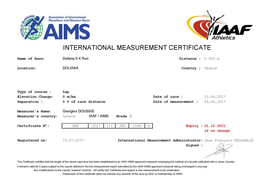 Επίσημη πιστοποίηση για τη διαδρομή των 5 Km στα Άνω Δολιανά!