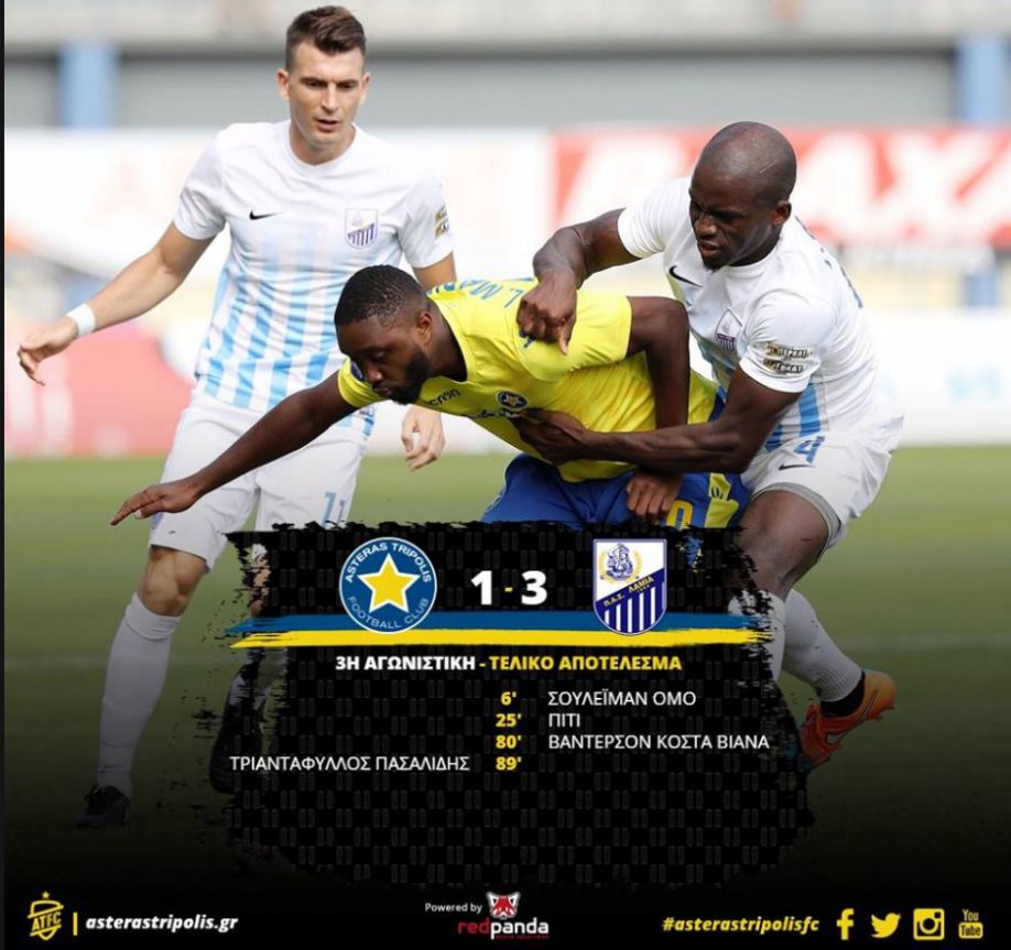 Το Σάββατο, ο Αστέρας έχασε με 1-3 από τη Λαμία που προηγήθηκε με 0-3 με γκολ των Όμο, Πίτι και Βάντερσον, ενώ ο Αστέρας μείωσε στο 88ο λεπτό με τον Πασαλίδη.
