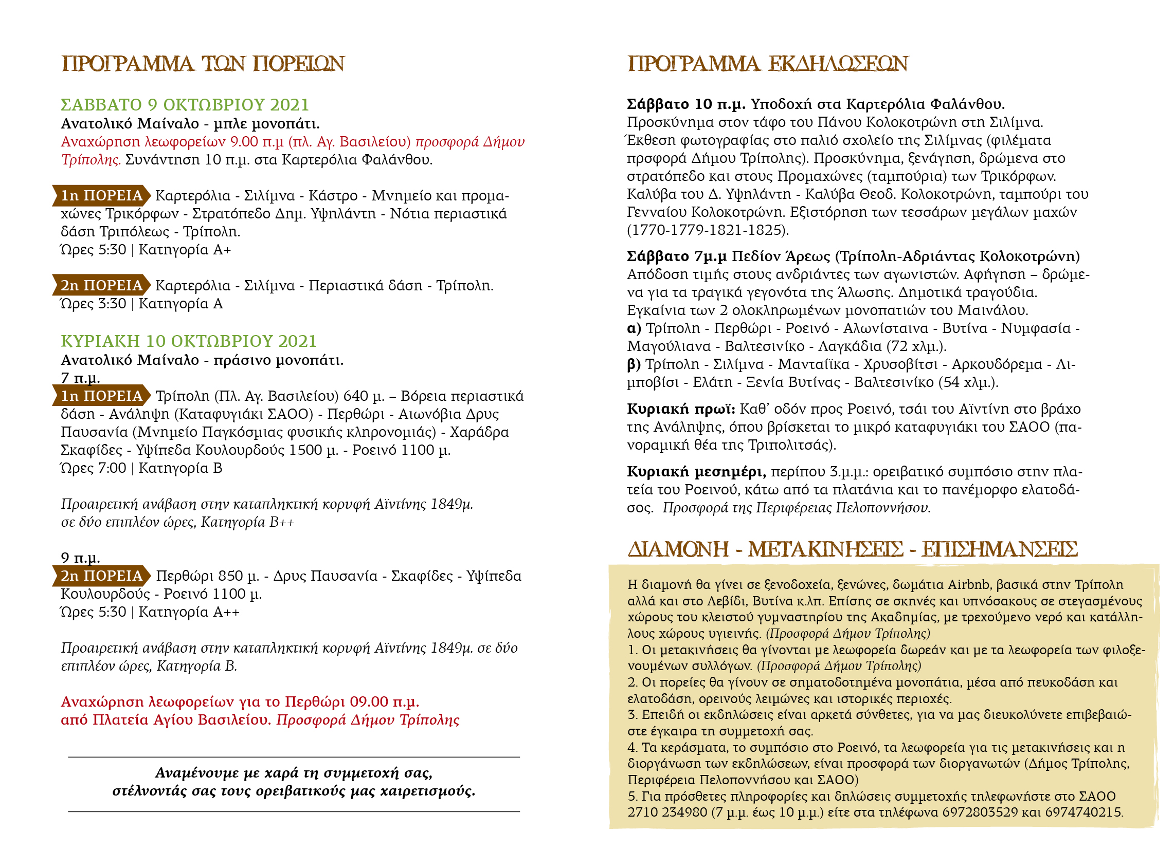 2η πορεία: Καρτερόλια – Σιλίμνα – περιαστικά δάση - Τρίπολη. Ώρες 3:30 Κατηγορ. Α