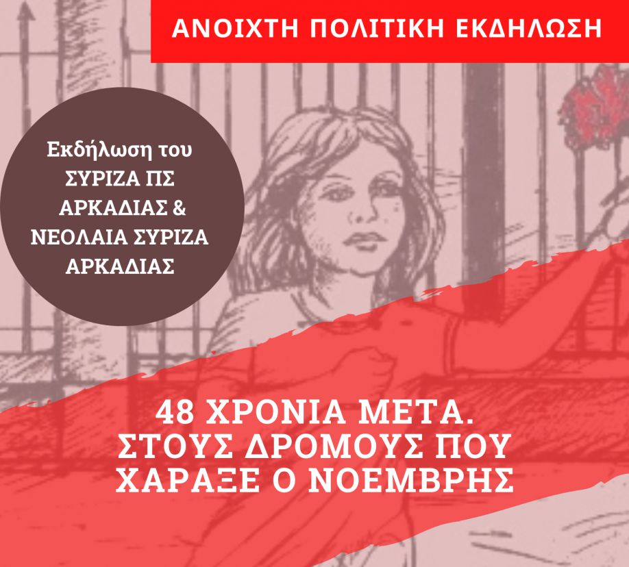 Ο ΣΥΡΙΖΑ- ΠΣ Αρκαδίας και η νεολαία ΣΥΡΙΖΑ πραγματοποιούμε εκδήλωση μνήμης και τιμής στην εξέγερση του Πολυτεχνείου με τη συμμετοχή του Δημήτρη Χατζησωκράτη, μέλους της ΣΥΝΤΟΝΙΣΤΙΚΗΣ ΕΠΙΤΡΟΠΗΣ ΚΑΤΑΛΗΨΗΣ, ο οποίος θα μιλήσει για τα γεγονότα και τις παρακαταθήκες του αγώνα.