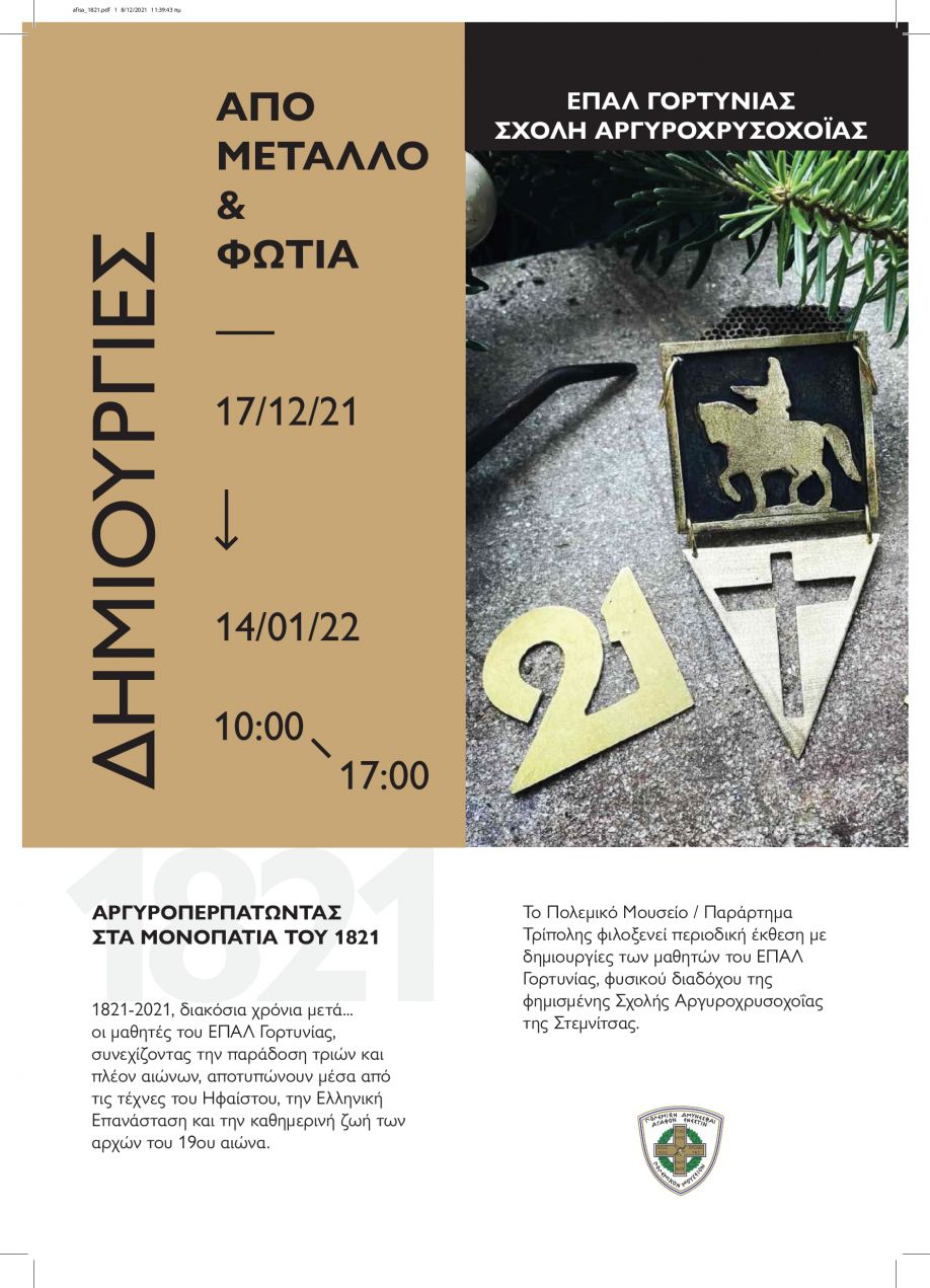 1821-2021, διακόσια χρόνια μετά..., οι μαθητές του Επαγγελματικού Λυκείου Γορτυνίας, φυσικού διαδόχου της φημισμένης Σχολής Αγυροχρυσοχοΐας της Στεμνίτσας, συνεχίζοντας την παράδοση τριών και πλέον αιώνων, αποτυπώνουν μέσα από τις τέχνες και τη φαντασία τους, την Ελληνική Επανάσταση και την καθημερινή ζωή των αρχών του 19ου αιώνα, και εκθέτουν τις δημιουργίες τους στο φιλόξενο χώρο του Πολεμικού Μουσείου Τρίπολης (Πλατεία Αγίου Βασιλείου & Εθνομαρτύρων 1)