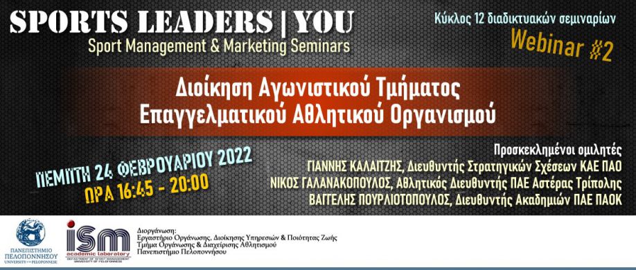 Το Εργαστήριο Οργάνωσης, Διοίκησης Υπηρεσιών & Ποιότητας Ζωής του Τμήματος Οργάνωσης & Διαχείρισης Αθλητισμού του Πανεπιστημίου Πελοποννήσου διοργανώνει διαδικτυακή εκδήλωση την Πέμπτη 24 Φεβρουαρίου 2022, με θέμα "Διοίκηση Αγωνιστικού Τμήματος Επαγγελματικού Αθλητικού Οργανισμού".