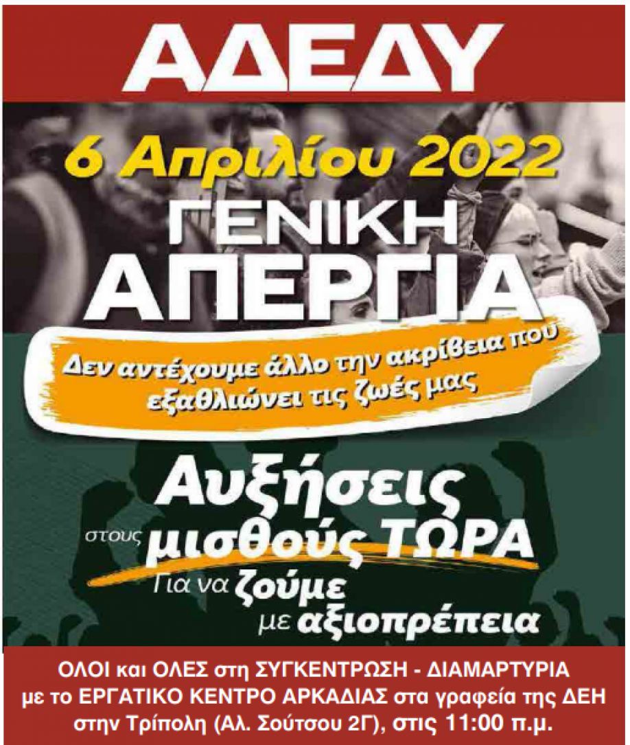 Απευθύνουμε κάλεσμα συμμετοχής στη μεγάλη πανελλαδική – πανεργατική απεργία στις 6 Απρίλη και στην απεργιακή συγκέντρωση στις 11πμ στα γραφεία Εμπορία της ΔΕΗ ΑΛ.ΣΟΥΤΣΟΥ 2Γ στη Τρίπολη, σε όλα τα σωματεία και τους εργαζόμενους της Αρκαδίας, στους συνταξιούχους, στους αυτοαπασχολούμενους, στις γυναίκες και στη νεολαία που έχουν «γονατίσει» από την ακρίβεια, που βλέπουν το εισόδημά τους να ξεζουμίζεται, που παρακολουθούν με αποτροπιασμό τη βαρβαρότητα του άδικου πολέμου στην Ουκρανία, τη μετατροπή της χώρας σε πολεμικό προγεφύρωμα, τις επιπτώσεις του πολέμου την πληρώνουν όλοι οι λαοί και κυρίως η Ευρώπη.