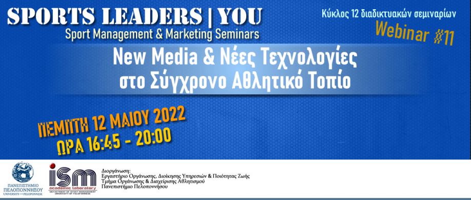 Το Εργαστήριο Οργάνωσης, Διοίκησης Υπηρεσιών & Ποιότητας Ζωής του Τμήματος Οργάνωσης & Διαχείρισης Αθλητισμού του Πανεπιστημίου Πελοποννήσου διοργανώνει διαδικτυακή εκδήλωση την Πέμπτη 12 Μαΐου 2022, με θέμα "New Media και Νέες Τεχνολογίες στο Σύγχρονο Αθλητικό Τοπίο”.