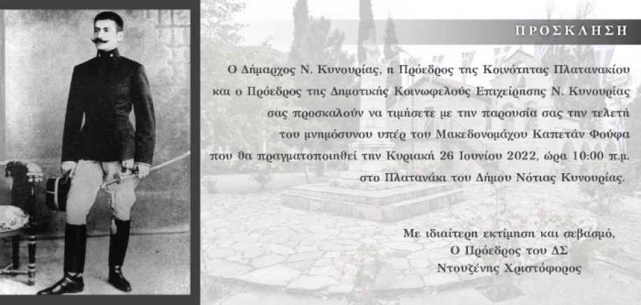 Ο Δήμαρχος Νότιας Κυνουρίας, η Πρόεδρος της Κοινότητας Πλατανακίου και ο Πρόεδρος της Δημοτικής Κοινωφελούς Επιχείρησης Νότιας Κυνουρίας σας προσκαλούν να τιμήσετε με την παρουσία σας την ετήσια εκδήλωση μνήμης για τον Μακεδονομάχο ήρωα του χωριού Ζαχαριά Ανδρούτσου - Παπαδά, γνωστού ως Καπετάν Φούφα που θα πραγματοποιηθεί την Κυριακή 26 Ιουνίου 2022, ώρα 10:00 π.μ. στο Πλατανάκι του Δήμου Νότιας Κυνουρίας. Θα πραγματοποιηθεί επιμνημόσυνη δέηση και κατάθεση στεφάνων στο χώρο όπου βρίσκεται ο ανδριάντας του ήρωα.