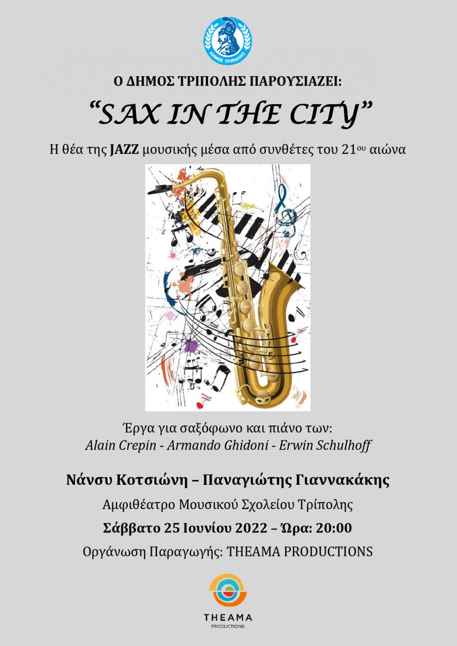Ο Δήμος Τρίπολης παρουσιάζει τη μουσική εκδήλωση “SAXINTHECITY” (Η θέα της JAZZ μουσικής μέσα από συνθέτες του 21ου αιώνα), το Σάββατο (25/6/2022), στις 8.00 το βράδυ στο Μουσικό Σχολείο, με είσοδο ελεύθερη.
