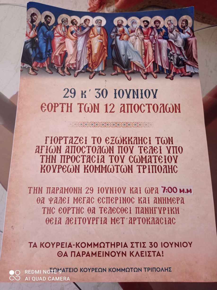 Προσκαλούμε τους ευσεβείς χριστιανούς όπως τιμήσουν με την παρουσία τους την μνήμη των Δώδεκα Αποστόλων!