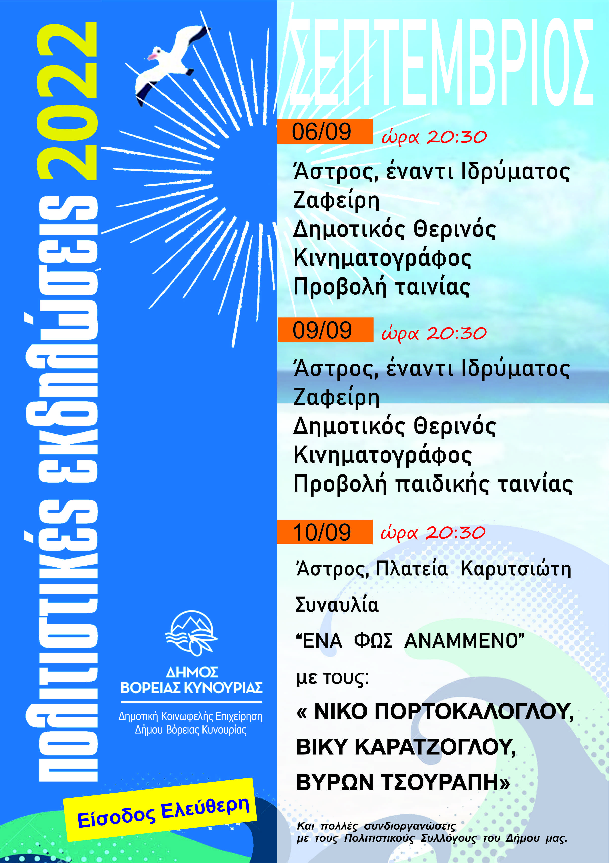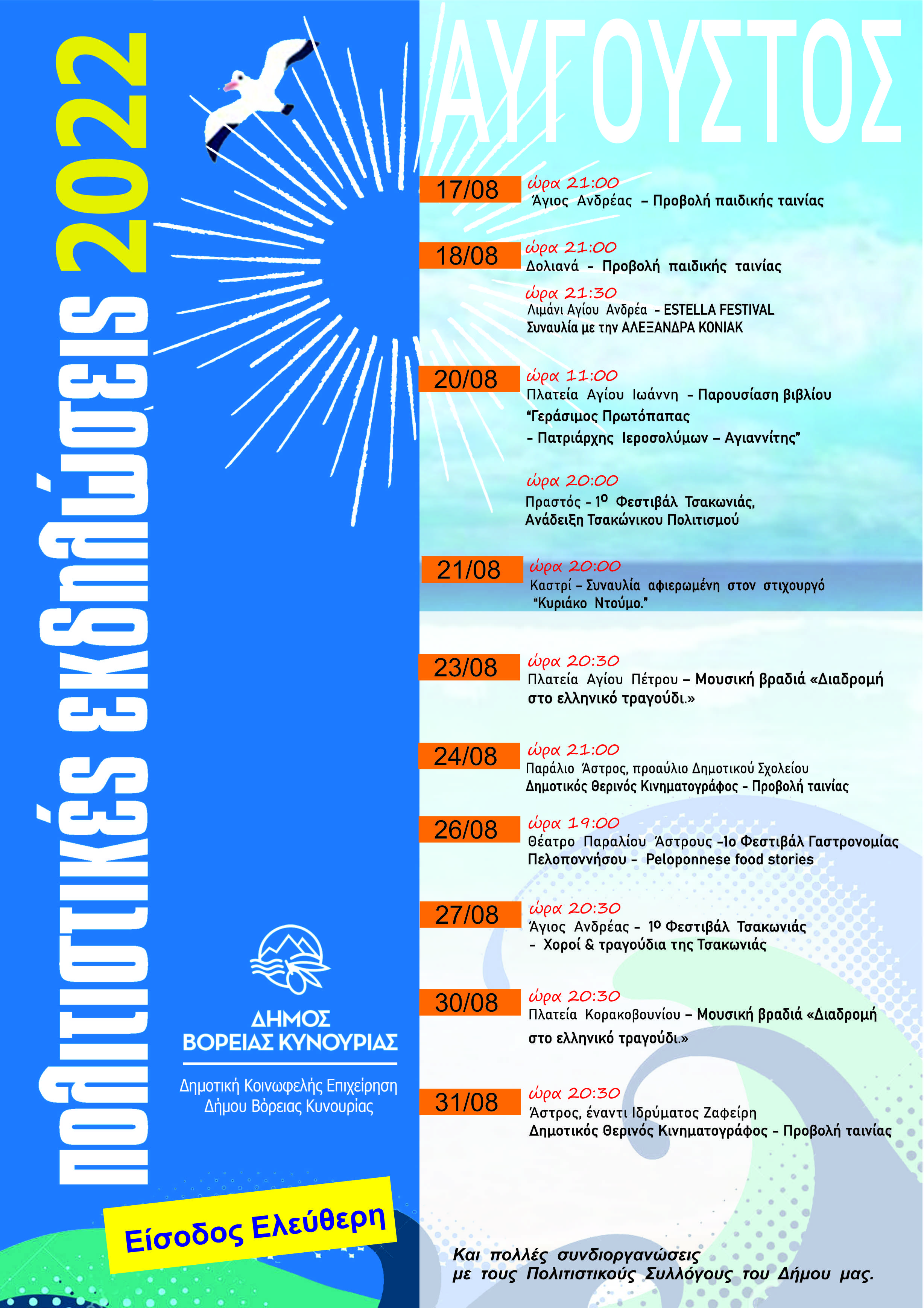 Ο Δήμος Βόρειας Κυνουρίας σε συνεργασία με τη Δημοτική Κοινωφελής Επιχείρηση κατάρτισαν και ανακοινώνουν το Πολιτιστικό Πρόγραμμα του καλοκαιριού!