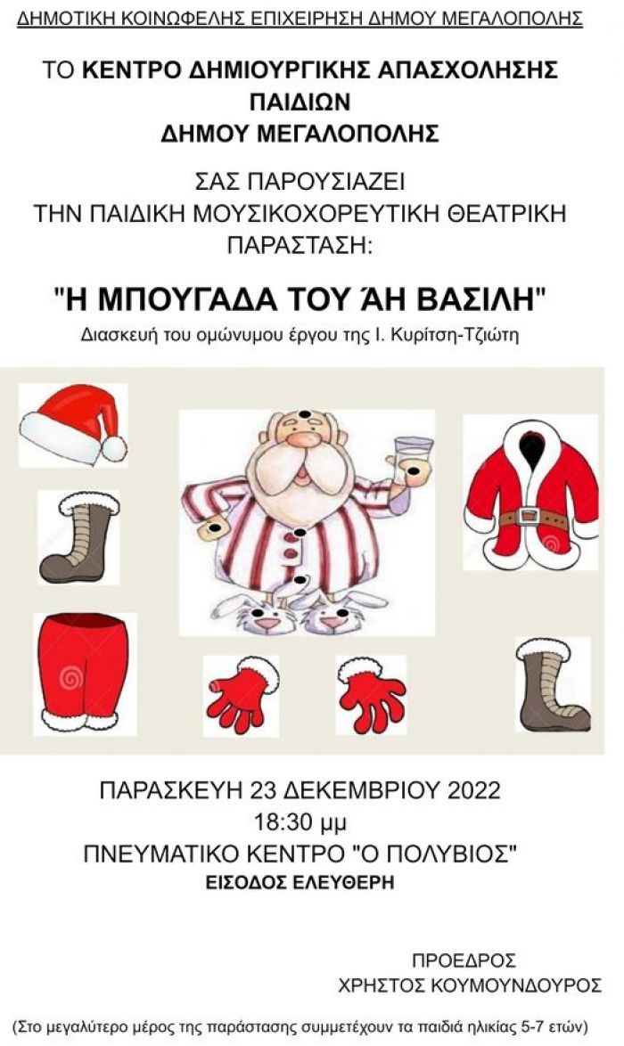Παιδική μουσικοχορευτική παράσταση «Η Μπουγάδα του Αϊ-Βασίλη», στο Πνευματικό Κέντρο «Ο Πολύβιος», την Παρασκευή 23 Δεκεμβρίου 2022, στις 18:30.