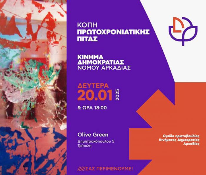 προσκαλεί φίλες και φίλους στην κοπή της Πρωτοχρονιάτικης Πίτας 2025, τη Δευτέρα 20 Ιανουαρίου, ώρα 6 μ.μ., στο καφέ GREEN OLIVE, Δημητρακοπούλου 5, ΤΡΙΠΟΛΗ.