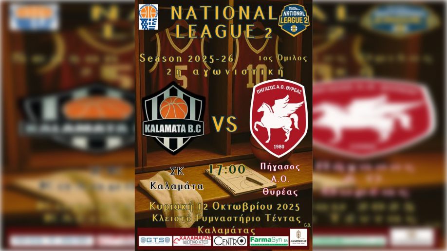 Ο ΑΟ Πήγασος Θυρέας, θα αντιμετωπίσει την Κυριακή 12 Οκτωβρίου 2025 και ώρα 17:00’, την ΣΚ Καλαμάτα στο Κλειστό Γυμναστήριο Τέντας Καλαμάτας, στο πλαίσιο της 2ης αγωνιστικής του πρωταθλήματος.