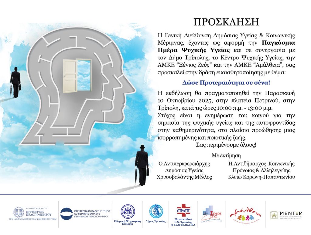 Με αφορμή την Παγκόσμια Ημέρα Ψυχικής Υγείας, την Παρασκευή 10 Οκτωβρίου 2025 (10.00-13.00) πραγματοποιείται δράση ενημέρωσης και ευαισθητοποίησης κοινού, στην Πλατεία Πετρινού, στο κέντρο της Τρίπολης. Η εκδήλωση διοργανώνεται από τη Γενική Διεύθυνση Δημόσιας Υγείας και Κοινωνικής Μέριμνας, στο πλαίσιο των στοχευμένων παρεμβάσεων για την ενίσχυση της πρόληψης και την προαγωγή της ψυχικής υγείας του πληθυσμού καθώς και την ενημέρωση γύρω από τις ψυχικές ασθένειες και την κινητοποίηση προσπαθειών για τη στήριξη της ψυχικής υγείας.