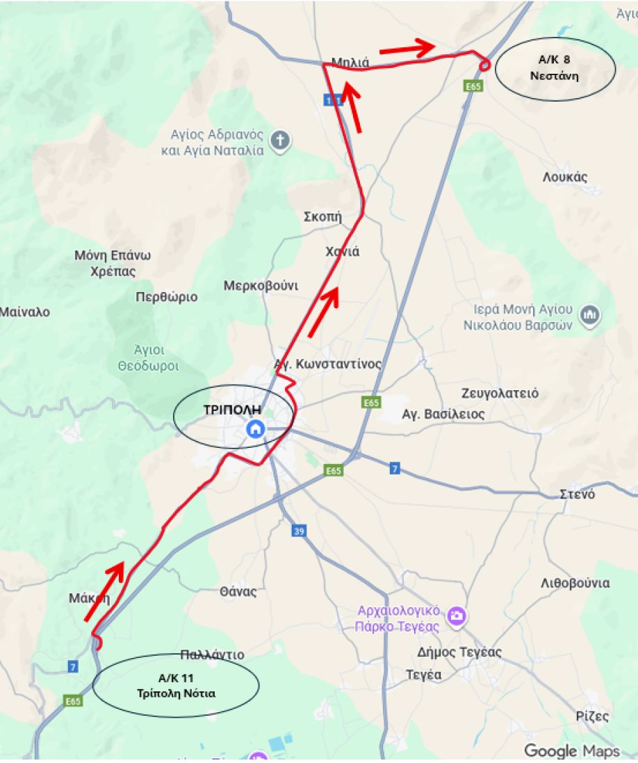 - Εκτροπή της κυκλοφορίας στην κατεύθυνση προς Αθήνα από τον κόμβο Τρίπολης Νότια (Χ.Θ 166+300) έως τον κόμβο Νεστάνης (Χ.Θ 148,1) για διάστημα έως 90 λεπτών εντός της χρονικής περιόδου 06:00-12:00. Κατά την παραπάνω χρονική περίοδο η κυκλοφορία των οχημάτων θα πραγματοποιείται μέσω της Π.Ε.Ο. Καλαμάτας -Τρίπολης, της παρακαμπτήριας διαδρομής Τρίπολης, της Ε.Ο. Τρίπολης - Πύργου και της συνδετήριας οδού Νεστάνης ακολουθώντας τις πινακίδες παράκαμψης. Οι κλάδοι εισόδου προς Αθήνα των κόμβων: Τρίπολης Νότια (Α-11-2), Τεγέας (Α-10-2), Τρίπολης Βόρεια (Α-9-2), και Νεστάνης (Α-8-2) και των ΣΕΑ Νεστάνης θα παραμένουν κλειστοί. Η κυκλοφορία προς Καλαμάτα δεν θα επηρεαστεί.