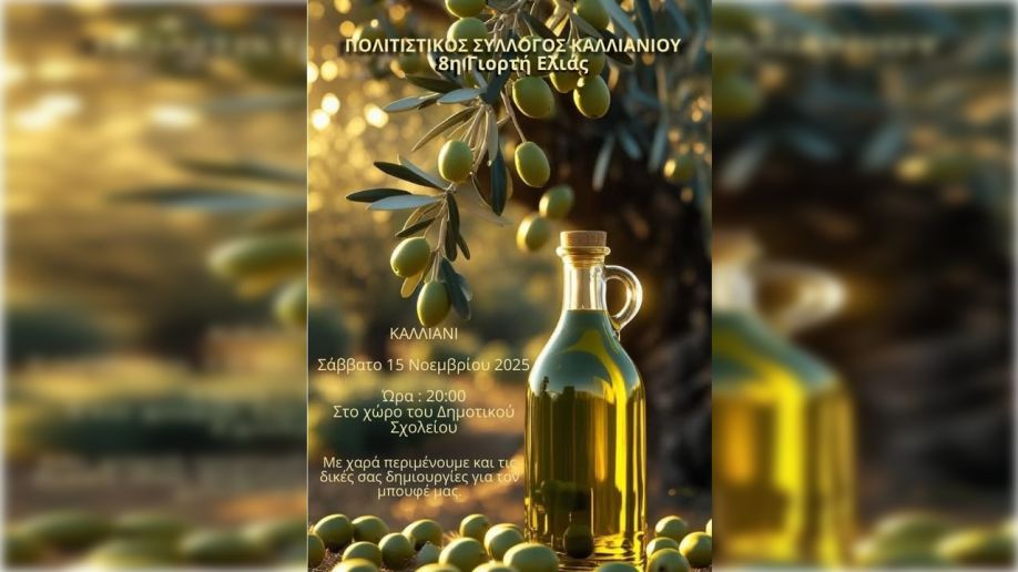 Ο Πολιτιστικός Σύλλογος Καλλιανίου διοργανώνει για όγδοη συνεχή χρονιά τη Γιορτή Ελιάς, το Σάββατο 15 Νοεμβρίου 2025, στις 8:00 το βράδυ, στον χώρο του Δημοτικού Σχολείου Καλλιανίου.