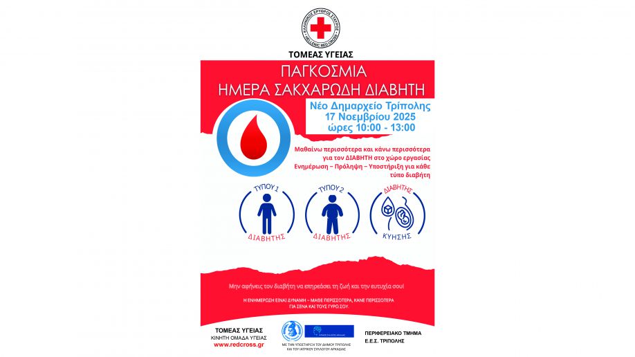 Το Περιφερειακό Τμήμα του Ερυθρού Σταυρού Τρίπολης, με την υποστήριξη του Ιατρικού Συλλόγου Αρκαδίας, διοργανώνει δράση ενημέρωσης και ευαισθητοποίησης του κοινού με αφορμή την Παγκόσμια Ημέρα Σακχαρώδη Διαβήτη (14 Νοεμβρίου).
