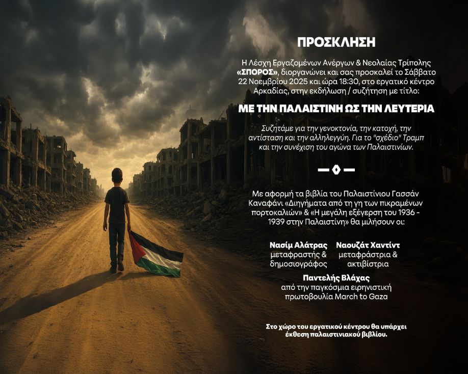 Η Λέσχη Εργαζομένων Ανέργων και Νεολαίας Τρίπολης ΄΄ΣΠΟΡΟΣ’’ διοργανώνει και σας προσκαλεί το Σάββατο 22 Νοεμβρίου 2025 και ώρα 18.30 στο Εργατικό Κέντρο Αρκαδίας ,στην εκδήλωση -συζήτηση :