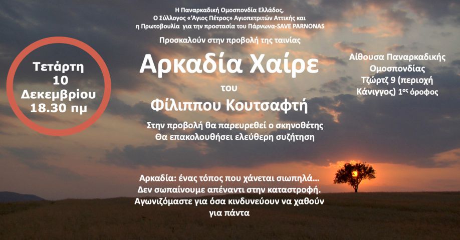 Η Παναρκαδική Ομοσπονδία Ελλάδος, ο Σύλλογος Αγιοπετριτών Αττικής «Ο Άγιος Πέτρος» και η Πρωτοβουλία για την Προστασία του Πάρνωνα – Save Parnonas διοργανώνουν μια ξεχωριστή προβολή της ταινίας «Αρκαδία Χαίρε» του Φίλιππου Κουτσαφτή.