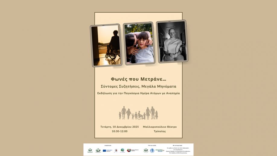 Η Περιφερειακή Ομοσπονδία Ατόμων με Αναπηρία Πελοποννήσου, το ΕUROPE DIRECT Πελοποννήσου, ο Σύλλογος Ατόμων με Αναπηρία ΠΕ Αρκαδίας «Παναγία η Γιάτρισσα», η Διεύθυνση Δευτεροβάθμιας Εκπαίδευσης Αρκαδίας και η ΣΑΕΚ Νοσηλευτικής του Παναρκαδικού Νοσοκομείου Τρίπολης σας προσκαλούν στην εκδήλωση με τίτλο «Φωνές που Μετράνε…Σύντομες Συζητήσεις, Μεγάλα Μηνύματα» η οποία θα πραγματοποιηθεί την Τετάρτη 10 Δεκεμβρίου 2025 στο Μαλλιαροπούλειο Θέατρο Τρίπολης και ώρα 10:30 με στόχο να τιμήσει την Παγκόσμια Ημέρα Ατόμων με Αναπηρία.