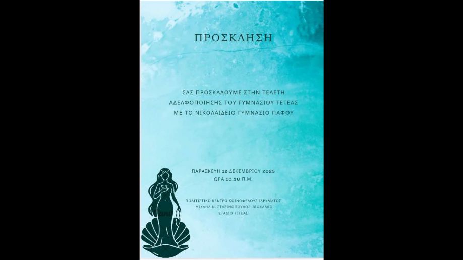 Την Παρασκευή 12/12/2025 και ώρα 10.30 π.μ. θα πραγματοποιηθεί στο Πολιτιστικό Κέντρο του Κοινωφελούς Ιδρύματος Μιλαήλ Ν. Στασινόπουλος-Βιοχάλκο η τελετή αδελφοποίησης του Γυμνασίου Τεγέας με το Νικολαΐδειο Γυμνάσιο Πάφου.