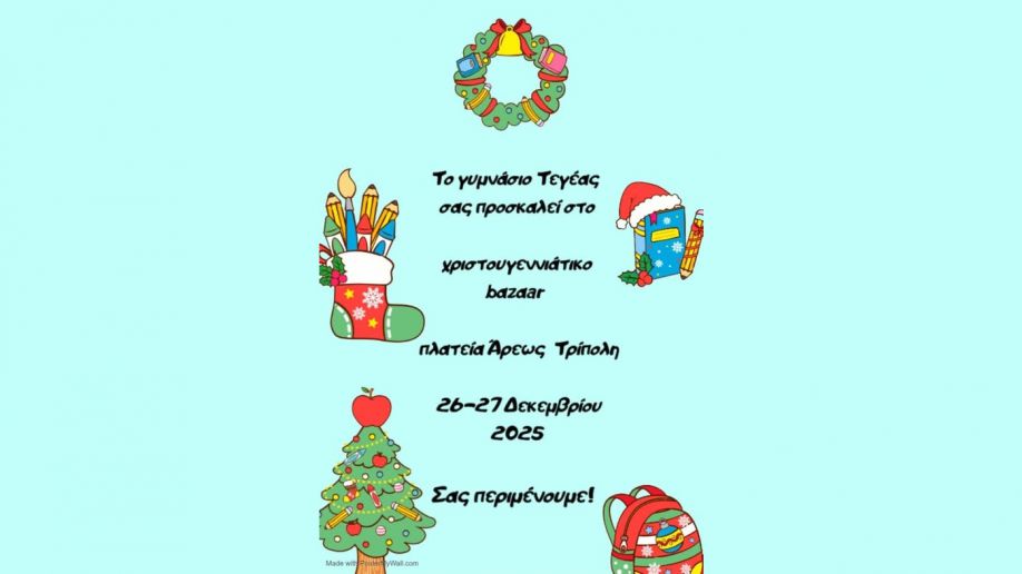 Oι μαθητές και οι μαθήτριες του Γυμνασίου Τεγέας σας προσκαλούν στο Χριστουγεννιάτικο bazaar που θα πραγματοποιηθεί στις 26 και 27 Δεκεμβρίου 2025 στην πλατεία Άρεως στην Τρίπολη.