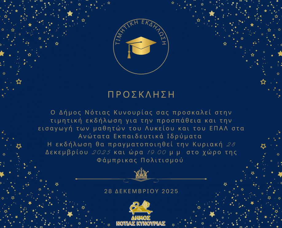 Ο Δήμος Νότιας Κυνουρίας διοργανώνει εκδήλωση βράβευσης για την προσπάθεια και την εισαγωγή των μαθητών και μαθητριών του Γενικού και του Επαγγελματικού Λυκείου του Δήμου μας, οι οποίοι έδωσαν εξετάσεις κατά το σχολικό έτος έτος 2024-2025 και αρκετοί πέτυχαν την εισαγωγή τους σε Ανώτατα και Ανώτερα Εκπαιδευτικά Ιδρύματα της χώρας.