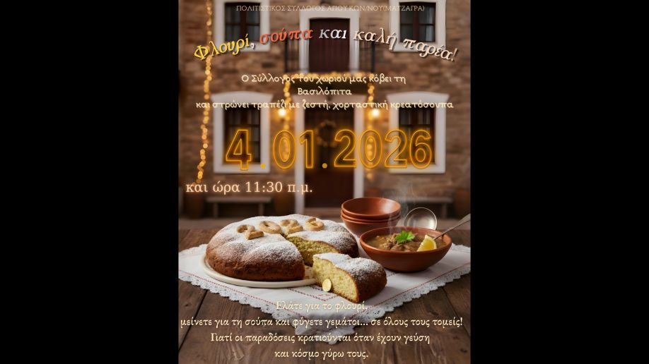 Την Κυριακή 4 Ιανουαρίου 2026, στις 11:30 π.μ., ο Σύλλογος κόβει τη βασιλόπιτα και υποδέχεται τη νέα χρονιά όπως της αξίζει: με χαμόγελα, κόσμο και ένα στρωμένο τραπέζι με ζεστή, χορταστική κρεατόσουπα.