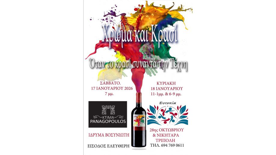 Το Οινοποιείο ΚΤΗΜΑ ΠΑΝΑΓΟΠΟΥΛΟΣ και το Τμήμα Ζωγραφικής Ενηλίκων της ΕΥΤΟΠΙΑΣ, ενώνουν τις δυνάμεις τους για μια μοναδική έκθεση ζωγραφικής, γεμάτη χρώμα, άρωμα και μουσική.