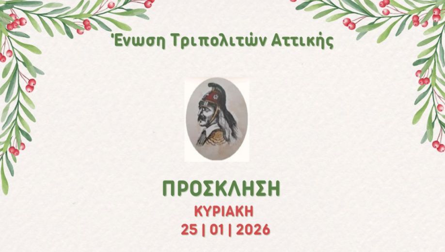 Η Πρόεδρος & το Διοικητικό Συμβούλιο της Ένωσης Τριπολιτών Αττικής σας καλούν να τιμήσετε με την παρουσία σας την εκδήλωση της κοπής της Βασιλόπιτας της Ένωσης που θα γίνει την Κυριακή 25 Ιανουαρίου 2026 και ώρα 11.00 π.μ. στην αίθουσα της Ένωσης Τριπολιτών Αττικής στην Αθήνα (οδός Πολυτεχνείου 12 και 3ης Σεπτεμβρίου – 1ος όροφος).