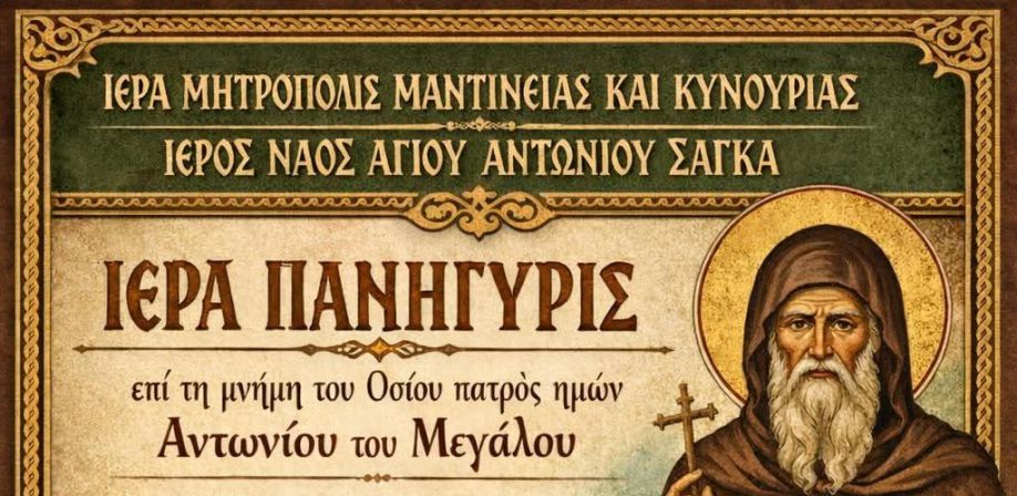 Με λαμπρότητα και κατάνυξη θα τιμηθεί και φέτος η μνήμη του Οσίου πατρός ημών Αντωνίου του Μεγάλου στον Ιερό Ναό Αγίου Αντωνίου Σαγκα, υπό την αιγίδα της Ιεράς Μητροπόλεως Μαντινείας και Κυνουρίας.